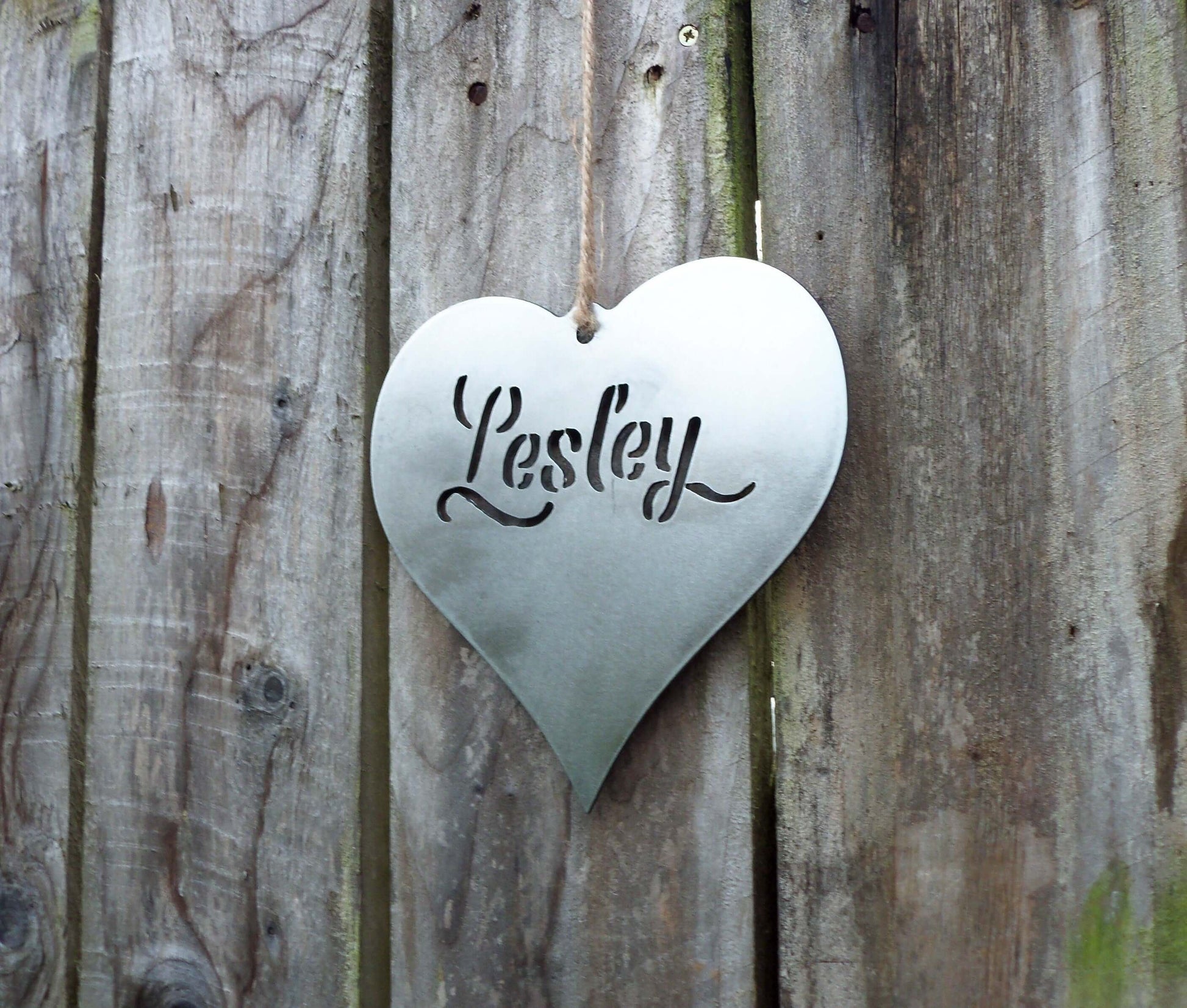 Industrial style Personalised HANGING HEART. Made from 2mm thick Steel and measures 190 mm Height x 200 mm Width approx. A beautiful solid Heart, features a Hanging Hole and a 50cm length of Jute String (Included!)