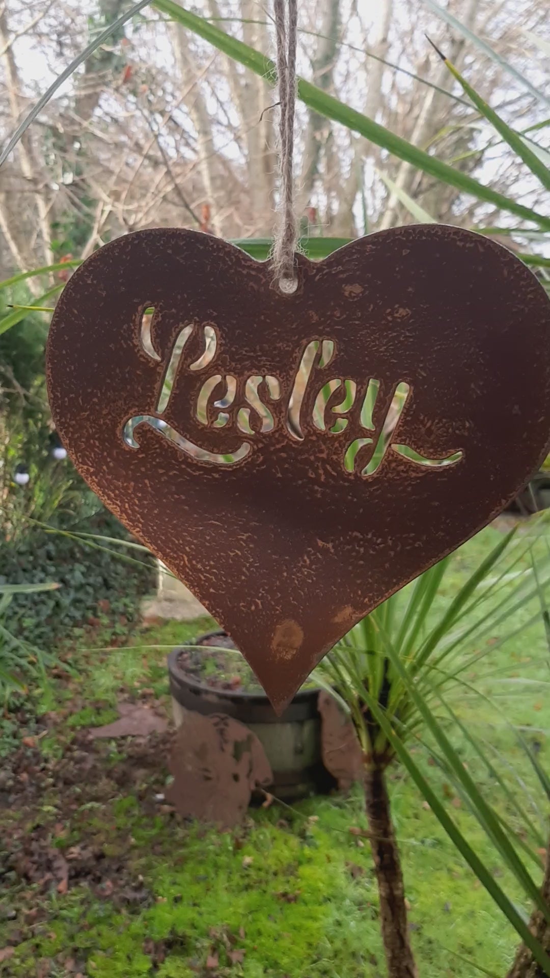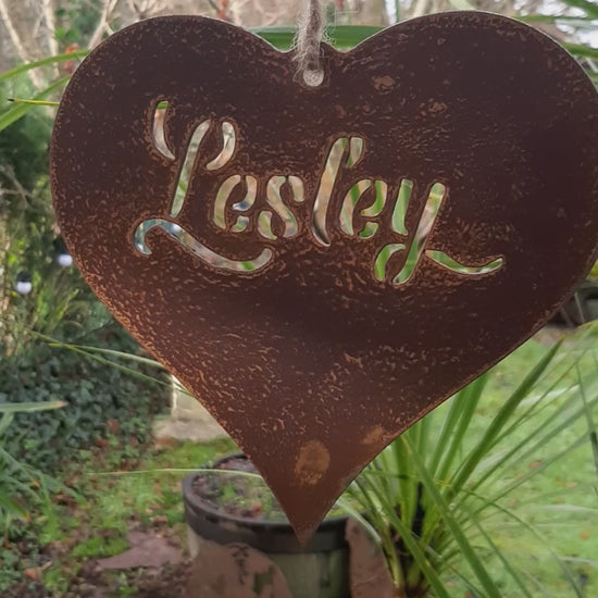Personalised rusty metal hanging heart garden ornament. Rustic Steel Art Decor. Metal Outdoor Decoration. Rusted